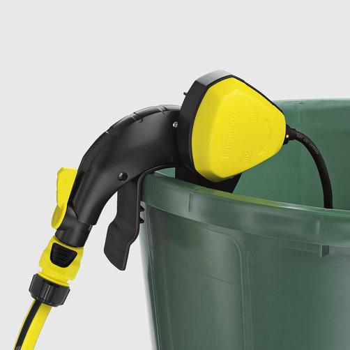 Насос для полива из бочки BP 1 Barrel, оснащенный автоматическим выключателем и специальной системой крепления на краю емкости.