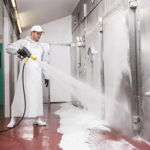 Аппарат высокого давления без подогрева воды HD 7/10 CXF разработан специально для уборки на предприятиях пищевой промышленности. Этот превосходно оснащенный аппарат компактного класса в вертикальном конструктивном исполнении отличается высокой мобильностью, простотой управления и длительным сроком службы всех компонентов. Удобству работы способствуют пистолет EASY!Force, благодаря использованию силы отдачи водяной струи сводящий к нулю усилие оттяжки рычага, и быстродействующие разъемы EASY!Lock, позволяющие присоединять и отсоединять принадлежности в 5 раз быстрее, чем при использовании обычных резьбовых разъемов. Значительно упрощают ее и регулятор Servo Control для плавного изменения давления и расхода воды непосредственно с пистолета, а также трехпозиционное сопло, обеспечивающее быстрое переключение вида струи. Дозирующий вентиль позволяет примешивать в струю низкого давления чистящее средство. В конструкции аппарата предусмотрен и ряд других практичных решений, в частности, держатели для принадлежностей и кабеля, отсек для сопел и барабан для шланга высокого давления.