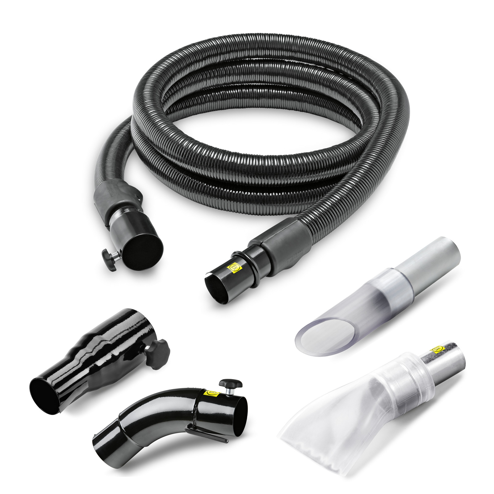 Промышленный комплект принадлежностей DN40 для сбора жидкости и стружки : шланг ME-PU 3 м (9.989-621.0), удлинительное колено 45° (9.977-679.0), электропроводящая стандартная насадка из ПВХ (9.989-674.0), адаптер (9.989-690.0), форсунка 90° DN40 (9.988-118.0). Для промышленных пылесосов (IVC / IVR).