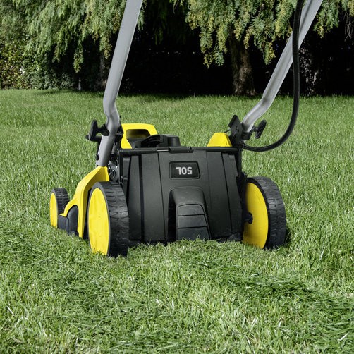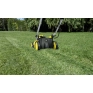 Рукоятка складывается для хранения аппарата с экономией места. Текстильный травосборник складывается для уменьшения места, занимаемого газонокосилкой при хранении.