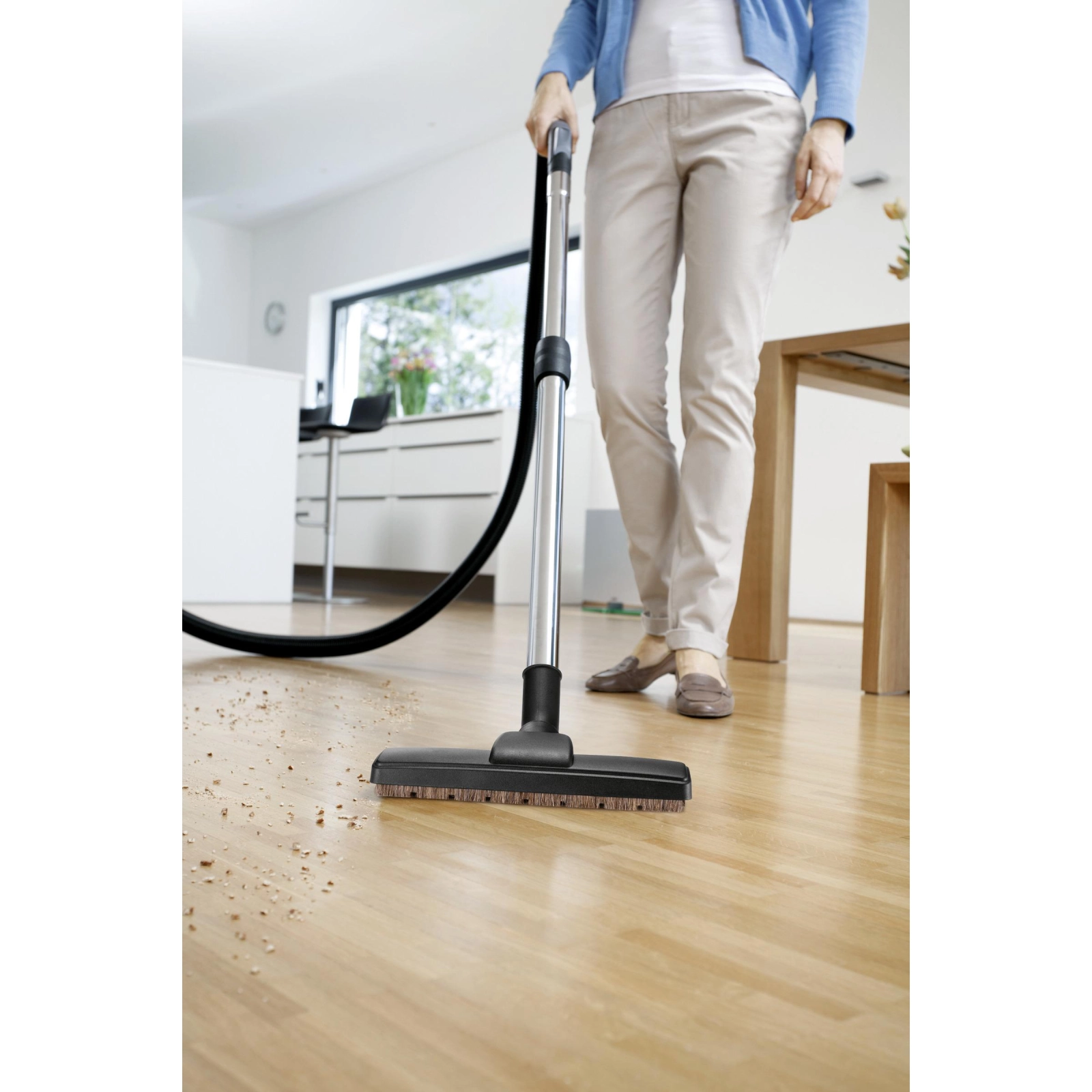 Насадка имеет держатель для установки на пылесосы VC 2/3. С натуральной щетиной для бережной очистки паркета и других твердых напольных покрытий.