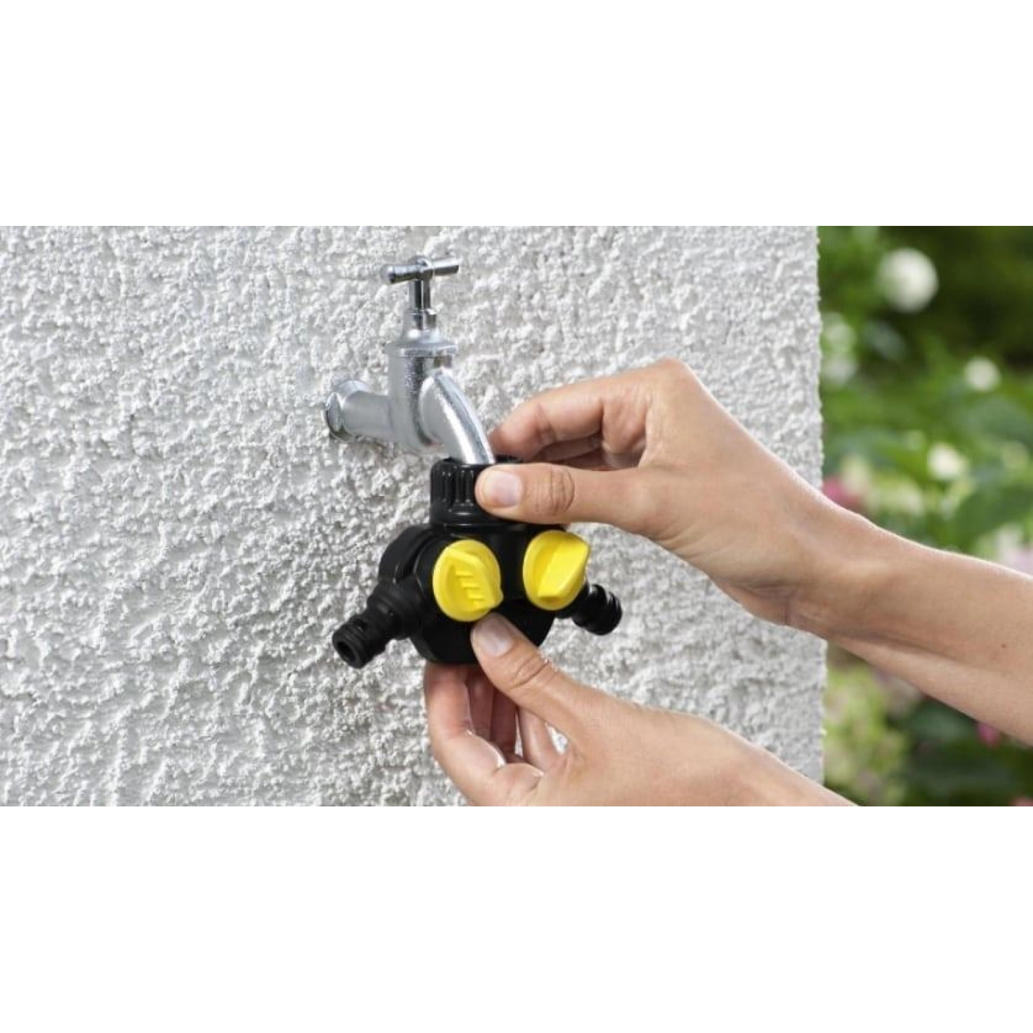 2 независимых выхода с регулятором расхода воды. Идеально подходит для присоединения двух шлангов к одному водопроводному крану с резьбой G1. Штуцер для присоединения к крану G3/4 с переходником G1/2.
